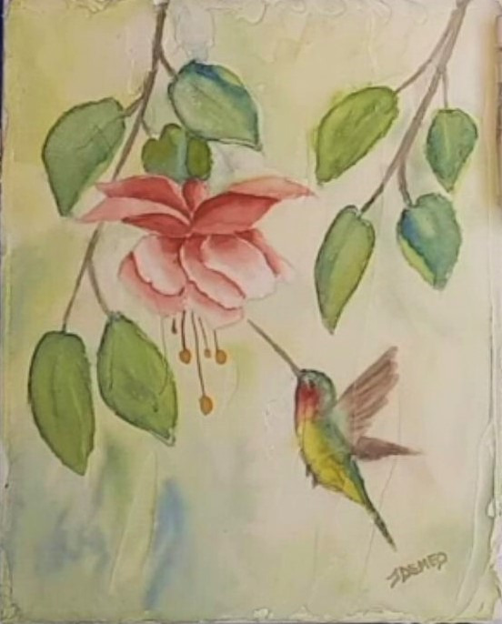 Beautiful Fuchsia flower with hummingbird in a step by step video . Created on a canvas 8" x 10" working on GOLDEN artist color Molding paste. Nontraditional watercolors.